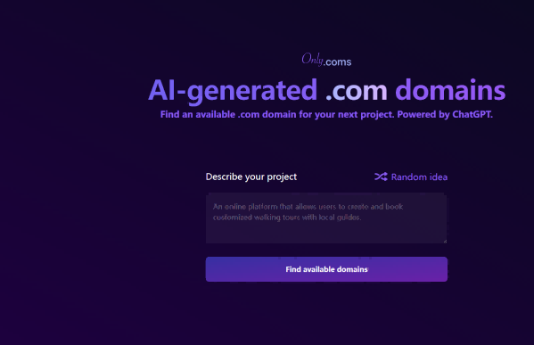 Onlycoms.com功能 Only.Coms是一款人工智能生成的工具,旨在帮助用户为其项目查找可用的 .com 域名。主要特点和优势包括: AI驱动的建议:利用ChatGPT根据自然语言输入生成相关域名 .com 专属域名:专注于最受欢迎且具有商业价值的域名扩展 用户友好的界面:允许用户根据项目描述轻松生成和查看可用域名 Only.Coms 的用例非常适合各种个人和团队: 为新企业寻找完美 .com 域名的企业家 希望为客户项目寻找可用域名的Web 开发人员 营销专业人士旨在为营销活动确保令人难忘且相关的 .com 域名 总体而言,Only.Coms 提供了独特且有价值的解决方案,用于查找根据用户的项目描述量身定制的可用 .com 域名。 官网