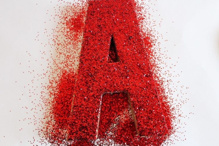 在胶水上撒上大量亮粉,直到覆盖胶水。摇动字母以去除多余的闪光。