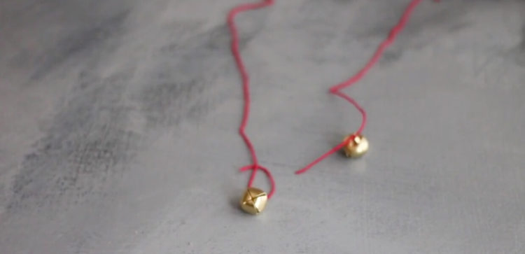 接下来,将 6 英寸的红绳绑在铃铛上,然后将绳子的末端粘在第一个盘子内侧的一侧。对另一侧重复步骤。