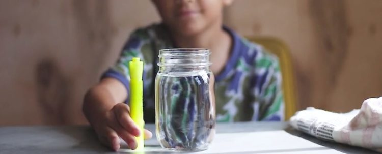将荧光笔毛毡放在水下并挤压,直到水沾上荧光笔墨水。