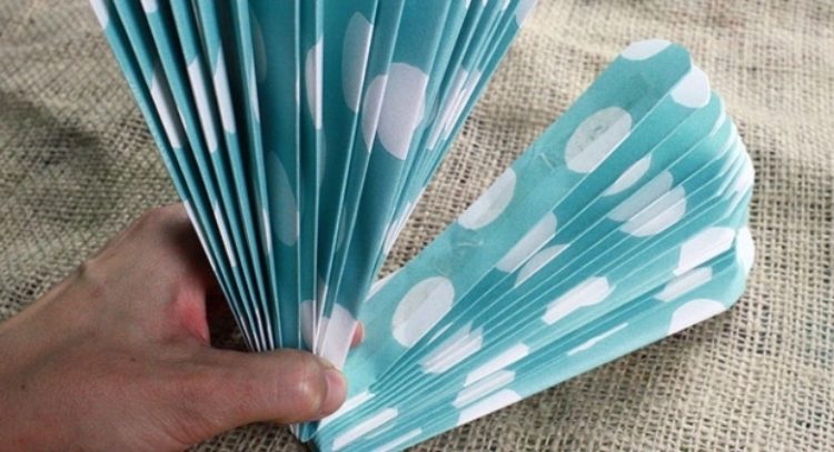 Accordian 将包装纸折叠成 1 英寸的褶皱,直到折叠完所切割的纸张的整个长度。重复上述步骤2次以上,这样你就得到了3条长条的手风琴折叠纸。将每个条带的边缘切成圆形或对角线,但要小心使其尺寸准确。