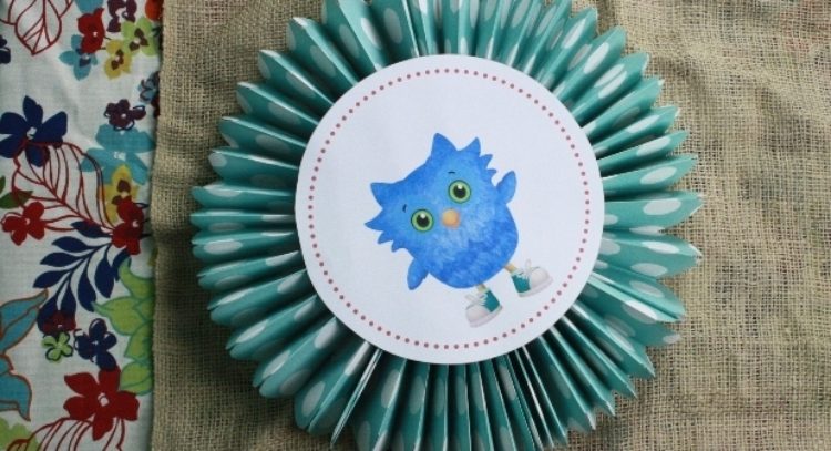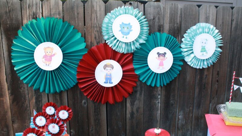 将纸板圆圈热粘到风车的后部中心(这样您就可以用图钉将其粘在墙上),然后将 Daniel Tiger 可打印圆圈热粘到前面,您就可以创建一个令人惊叹的背景了你的派对餐桌!