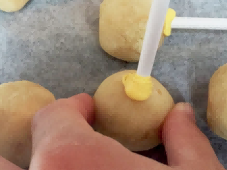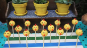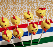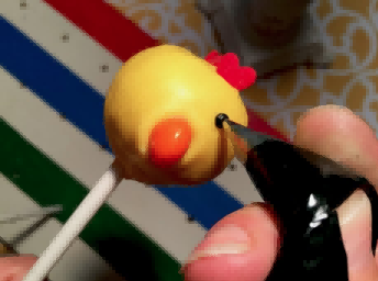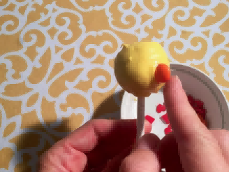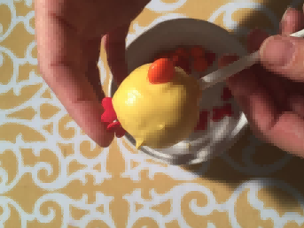 将橙色涂层的糖果块插入蛋糕棒棒糖的前部中心,制成鸡嘴。