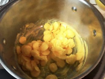 将黄色糖果放入双烤炉或微波炉中的杯子中加热融化,经常搅拌直至所有糖果融化。如果使用微波炉,每 20 秒搅拌一次糖果。如果糖果变得太稠,可添加几滴植物油。