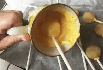 将棒棒糖的尖端浸入融化的糖果中,然后将棒棒糖插入圆形蛋糕的中心。重复此操作,直到所有的蛋糕圆都粘在棍子上。这些是基本的棒棒糖蛋糕,现在可以进行装饰了。