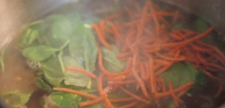 加入菠菜、胡萝卜和香葱,搅拌约 2 分钟,直至菠菜开始枯萎。上桌,饰以半个鸡蛋。