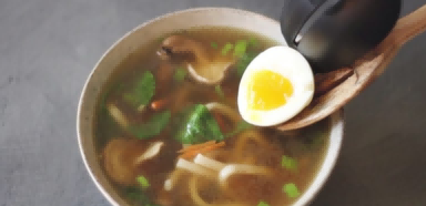 煮滚; 调小火,煮约 10 分钟,直至蘑菇变软。加入乌冬面,搅拌约 2-3 分钟,直至松散并煮熟。