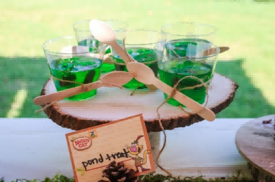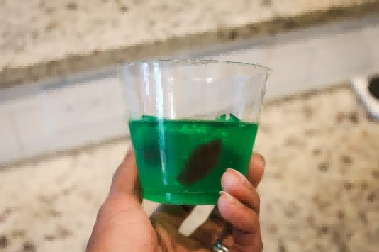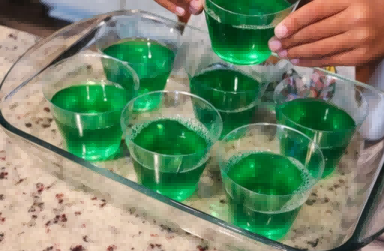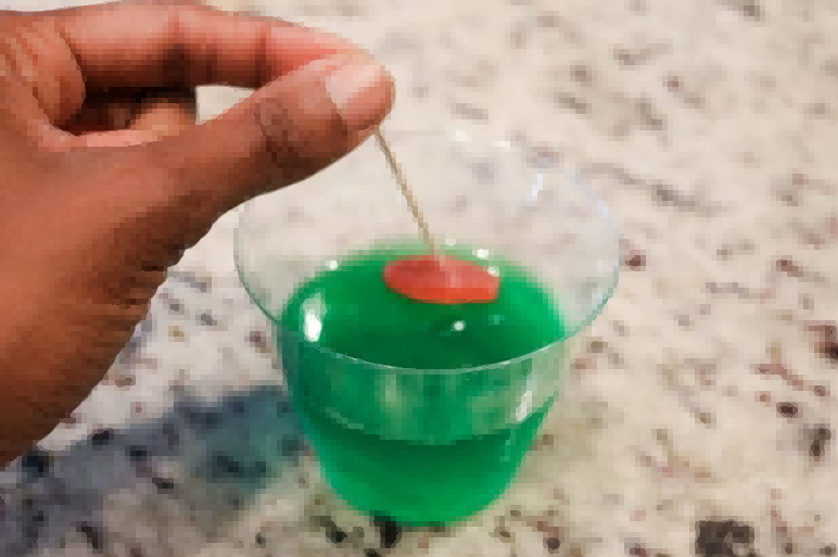 2.凝固后,用牙签将瑞典鱼放入果冻中。