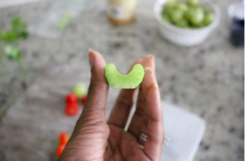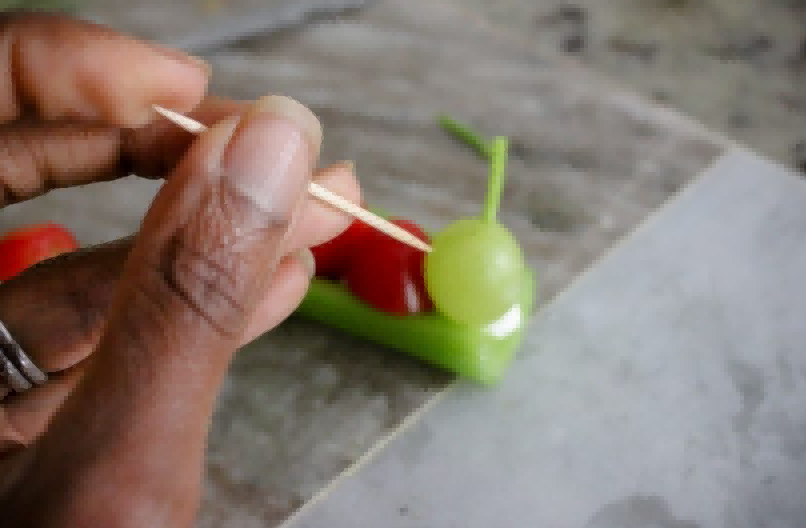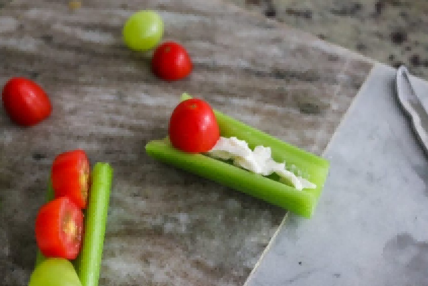 1.准备水果和蔬菜:冲洗所有水果和蔬菜并拍干。将芹菜切成几片,每片长 3 英寸-4 英寸。然后将芹菜底部的“峰”切掉,使其平放。如有必要,将葡萄番茄切成两半。将水果和蔬菜放在芹菜上(在用花生酱“粘合”它们之前)以确保它们正确贴合。