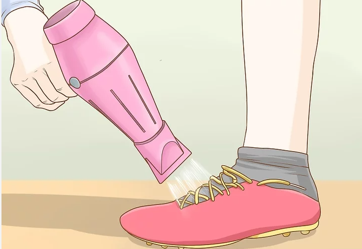 穿上一双厚袜子,然后穿上足球鞋。将吹风机调至高温,将鞋子每只加热 5 分钟。避免将吹风机喷嘴保持在一处时间过长:将设备慢慢移到鞋子表面,利用热量拉伸材料。